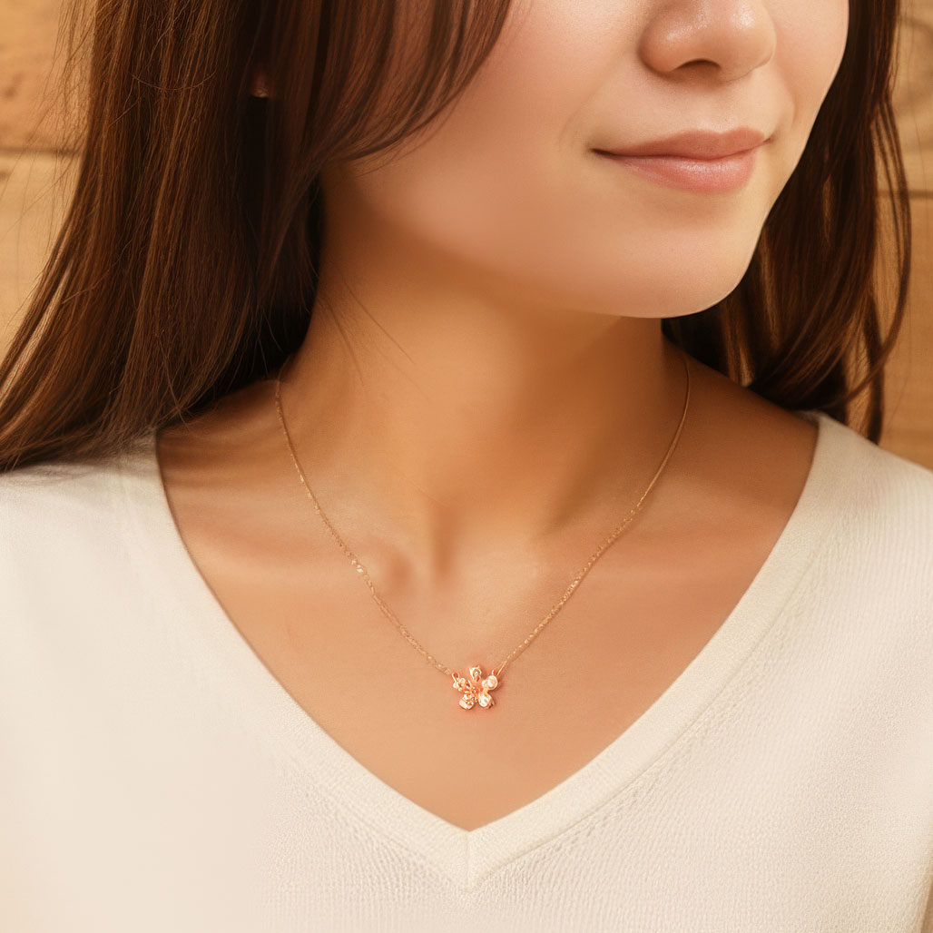 単なるピンクゴールドのネックレスとは一線を画す、立体感と奥行きのある輝きに。