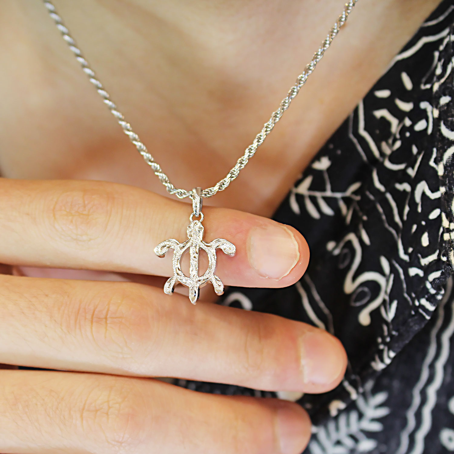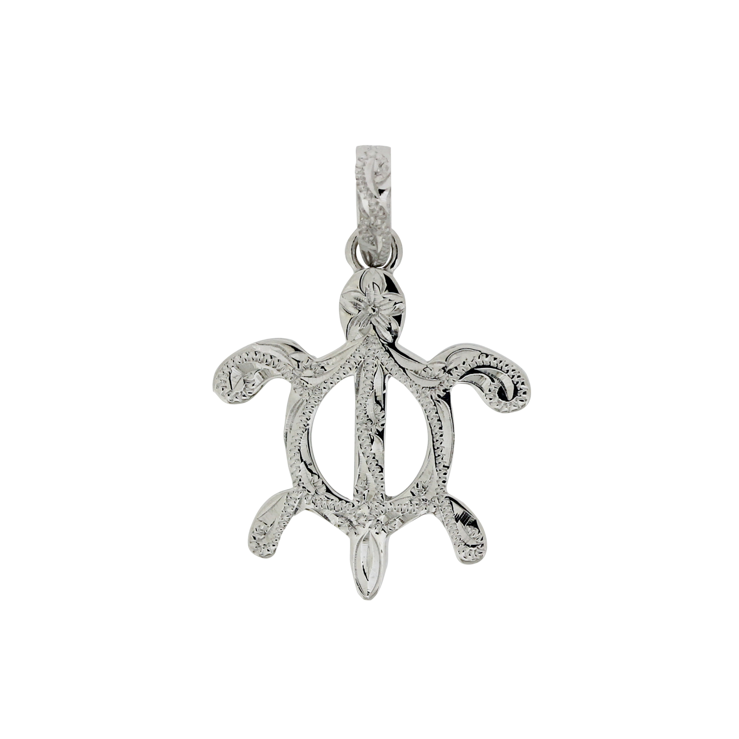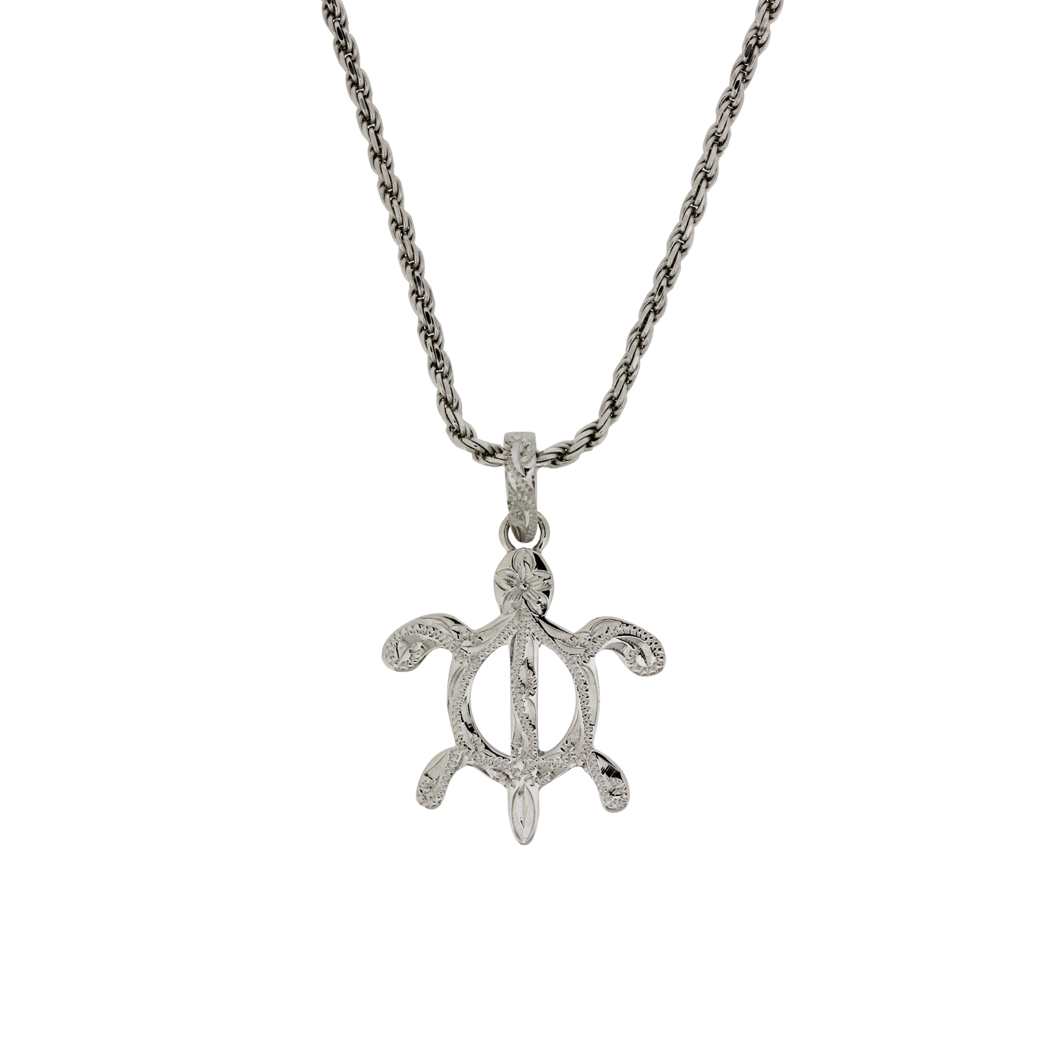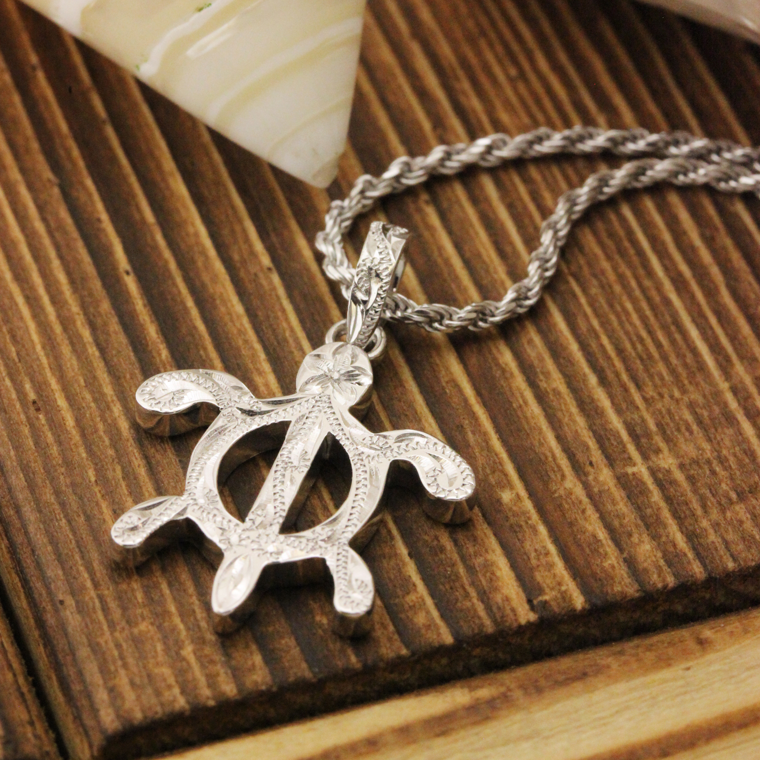 ハワイアンジュエリーの定番モチーフである「ペトログリフホヌ」に、ハワイアンの名前でポピュラーな《カヴィカ》と名付けたペンダント。