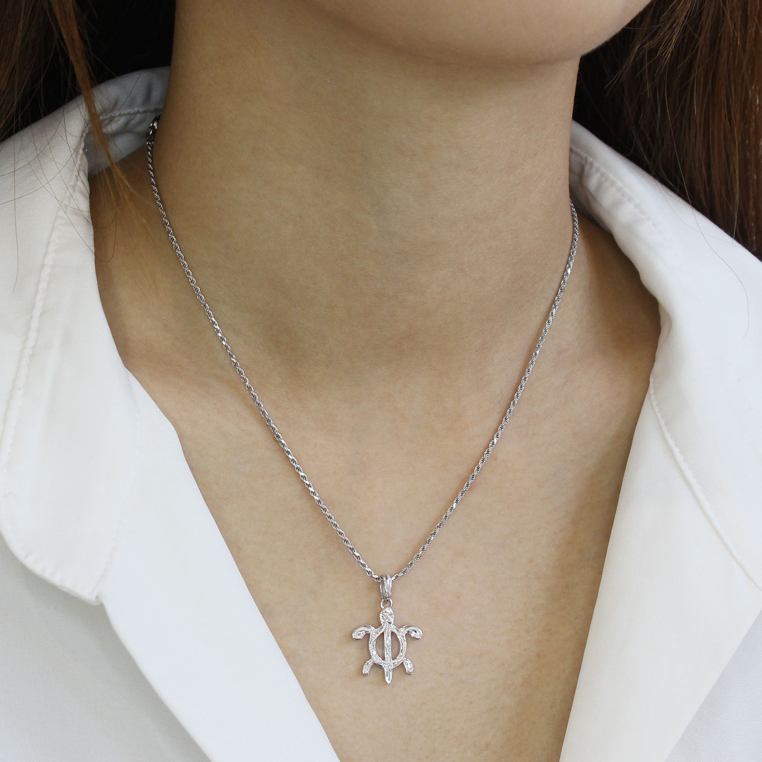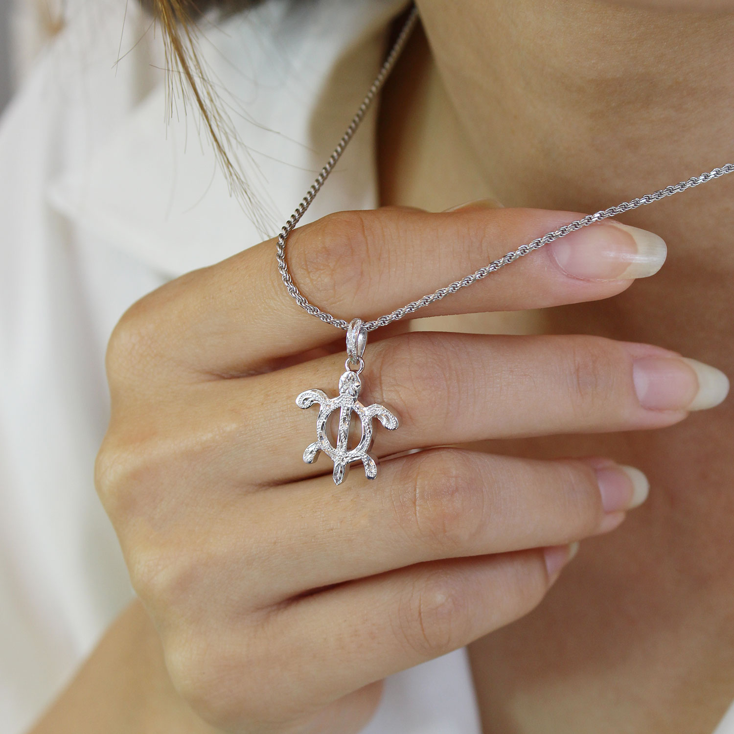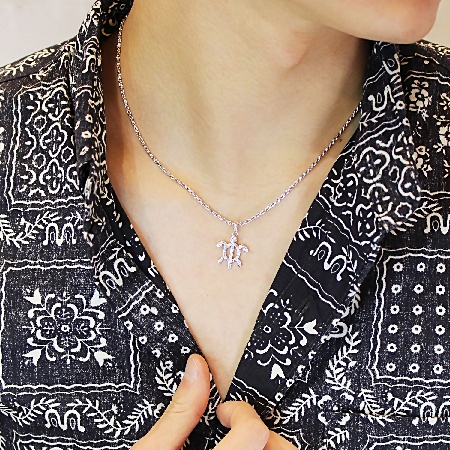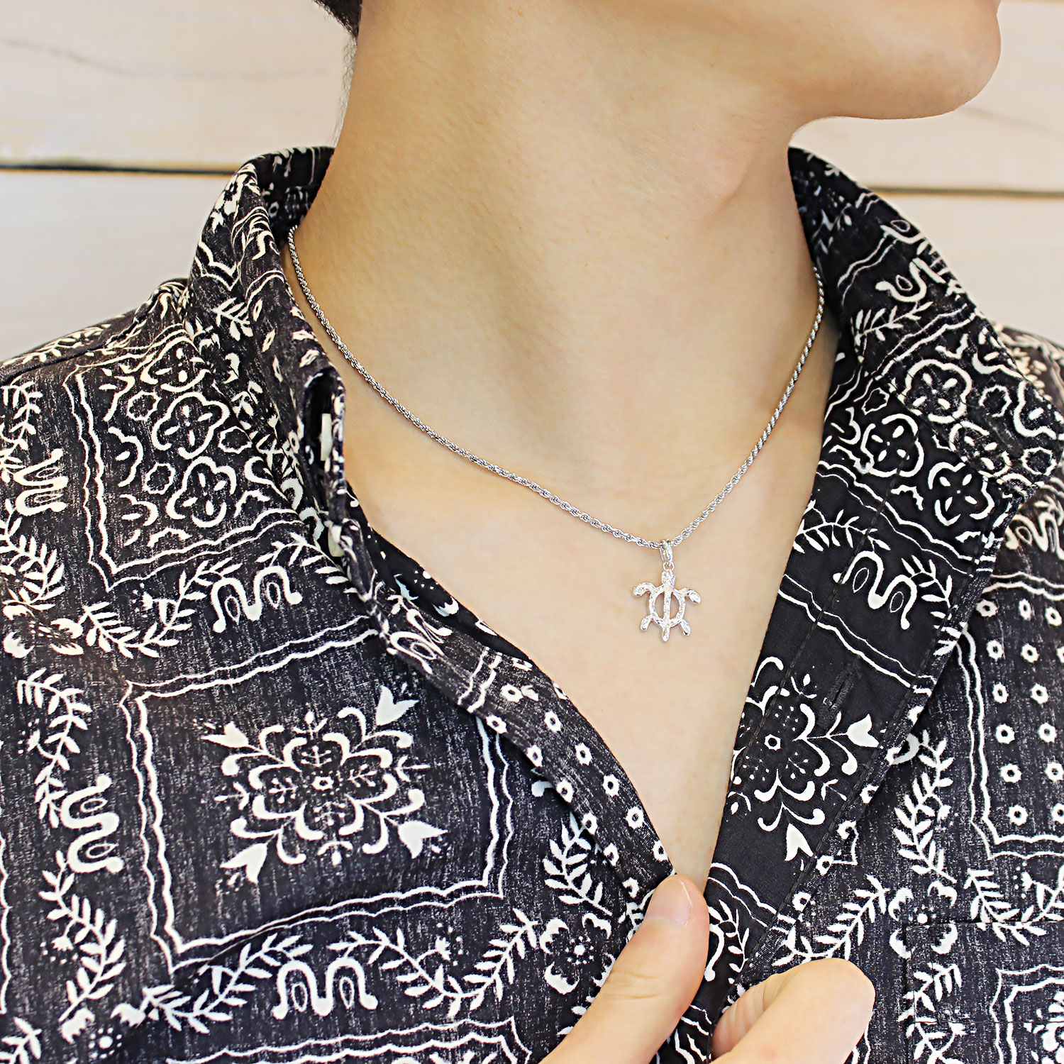 ハワイアンジュエリーの定番モチーフである「ペトログリフホヌ」に、ハワイアンの名前でポピュラーな《カヴィカ》と名付けたペンダント。