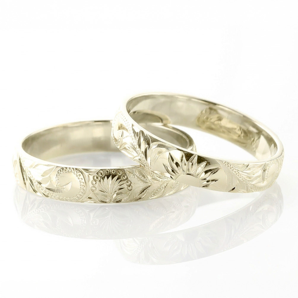 この鍛造製法によって生み出される美しい地金の上に、さらにハワイアンジュエリーならではの立体的な手彫りを施した、まさに贅沢な結婚指輪です。