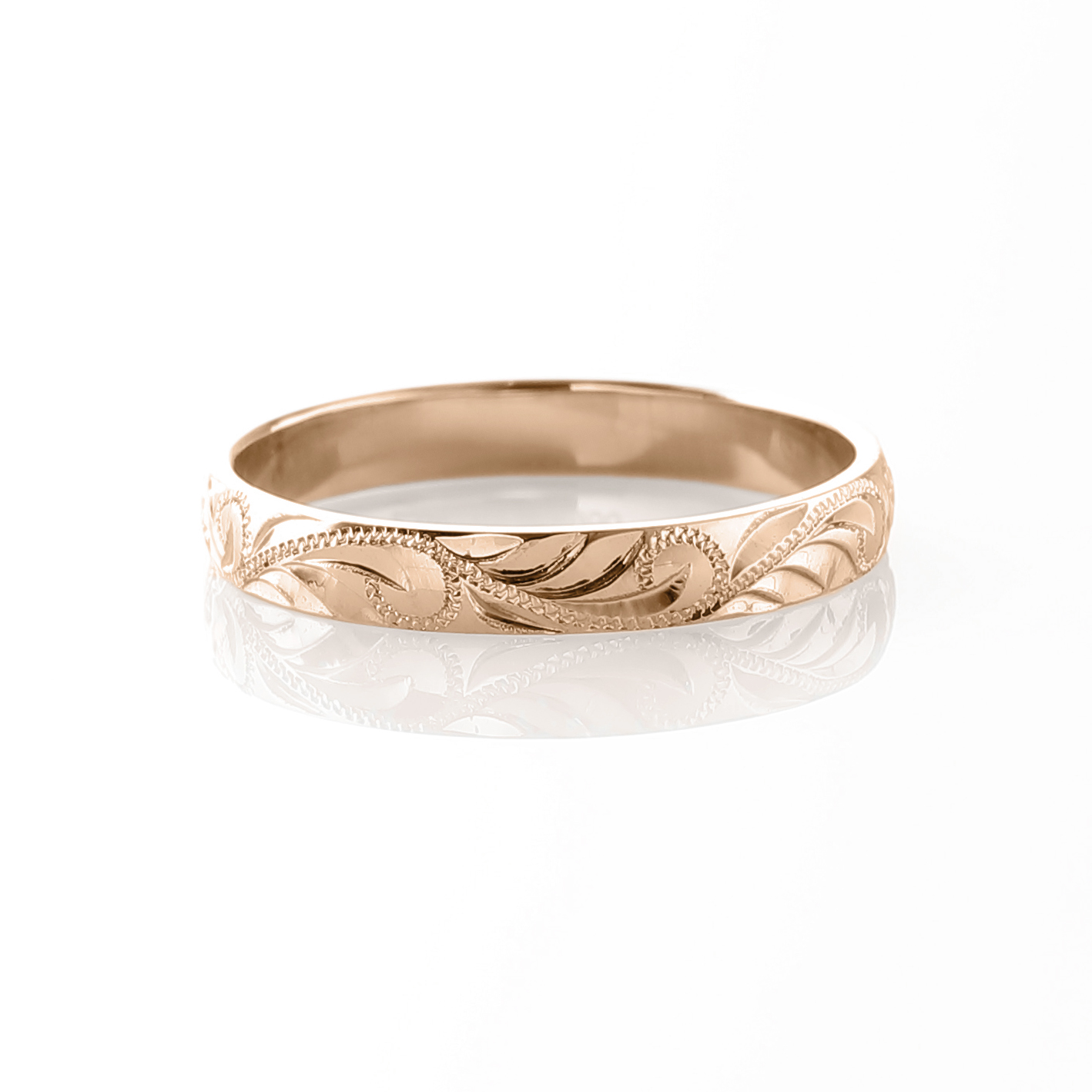 この鍛造製法によって生み出される美しい地金の上に、さらにハワイアンジュエリーならではの立体的な手彫りを施した、まさに贅沢な結婚指輪です。