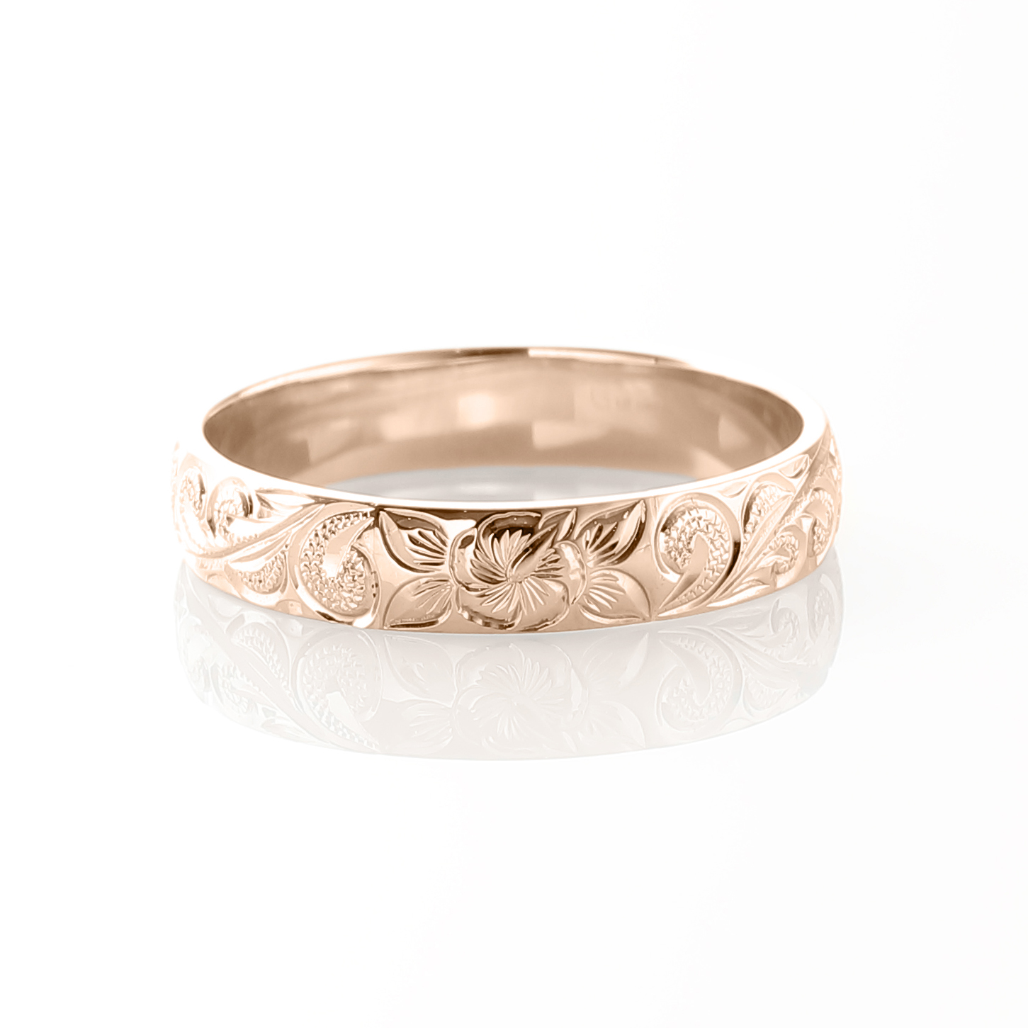 この鍛造製法によって生み出される美しい地金の上に、さらにハワイアンジュエリーならではの立体的な手彫りを施した、まさに贅沢な結婚指輪です。