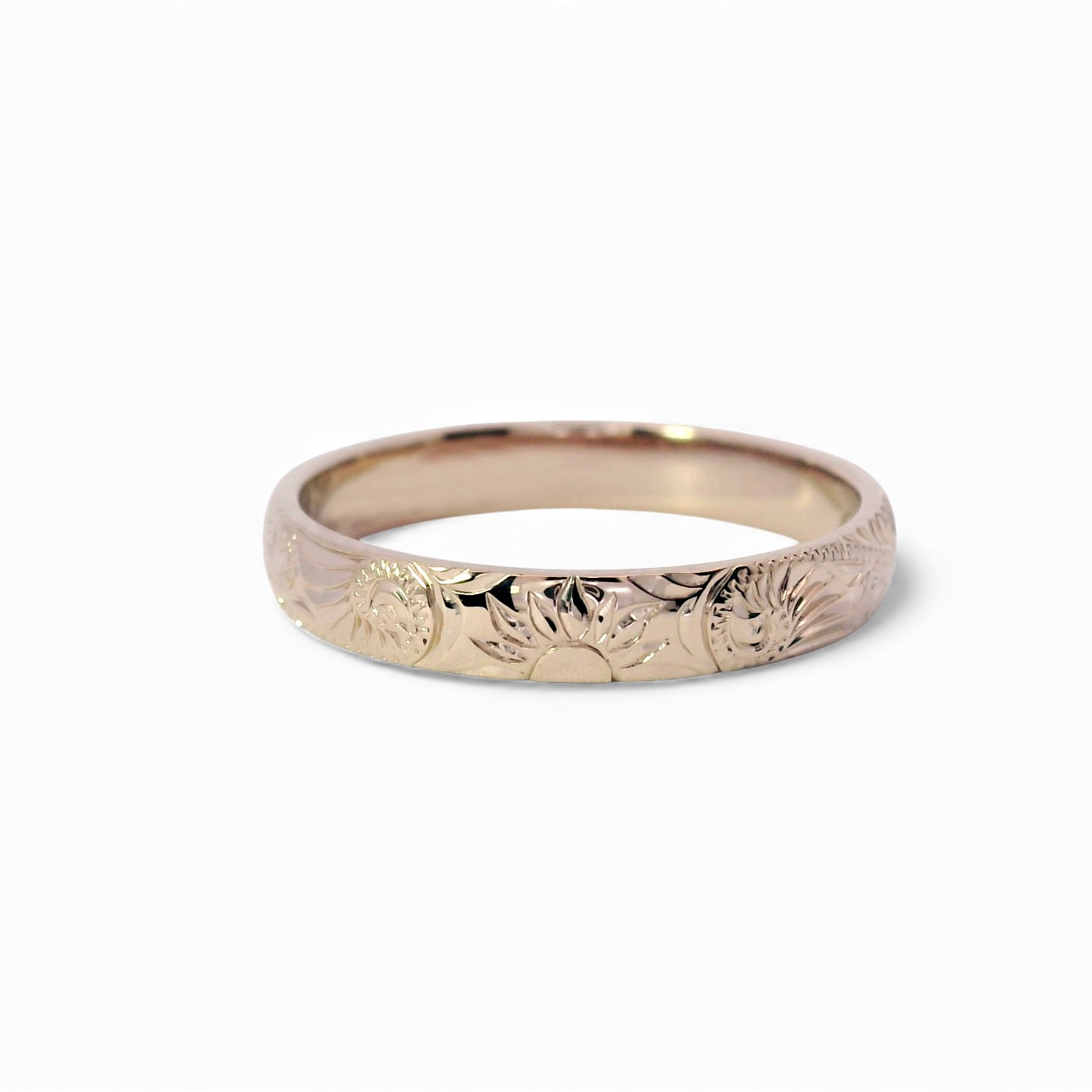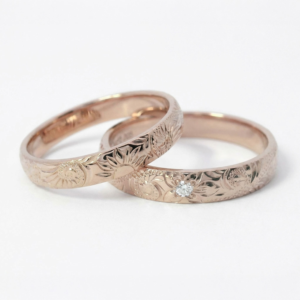 この鍛造製法によって生み出される美しい地金の上に、さらにハワイアンジュエリーならではの立体的な手彫りを施した、まさに贅沢な結婚指輪です。