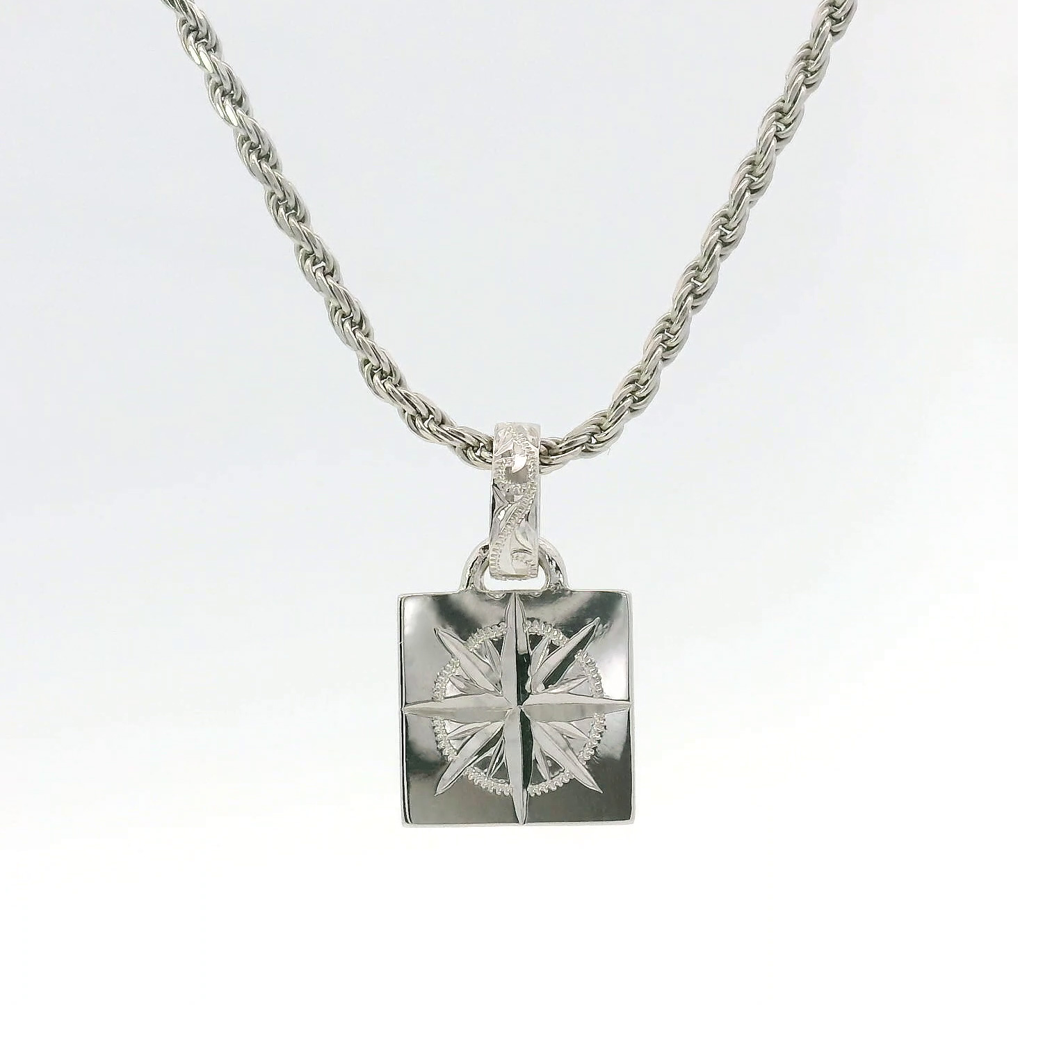 太陽と波を刻む手彫りハワイアンジュエリー/海から昇る光を閉じ込めた、正方形ペンダント